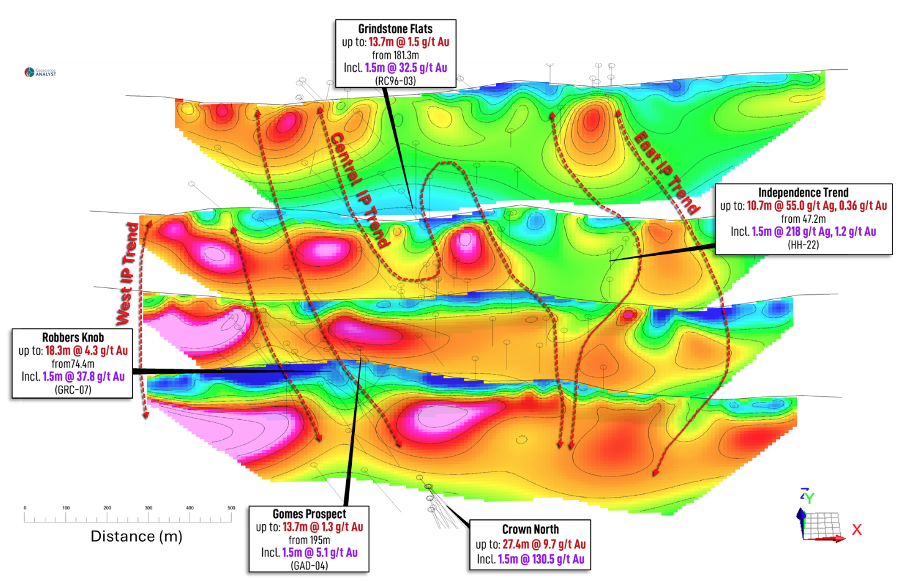 - Central IP Trend: This is a trend of high chargeability >20 Mv/V and up to 35Mv/V that extends for at least 800m length. The trend appears to extend north from the Adelaide Crow deposit and the Crown North Prospect held by Lodestar (27.4m at 9.7 g/t Au from 24m incl 1.5m at 130.5 g/t Au). The central part of the anomaly is coincident with the Gomes Prospect (13.7m at 1.3 g/t Aufrom 195m incl 1.5m at 5.1 g/t Au) and an area to the north is also coincident with the Grindstone Flats prospect (15m at 1.3 g/t Au from 239m). Most importantly, all 5 of the strongest anomalies along this trend remain untested adequately by drilling and represent new drill targets.