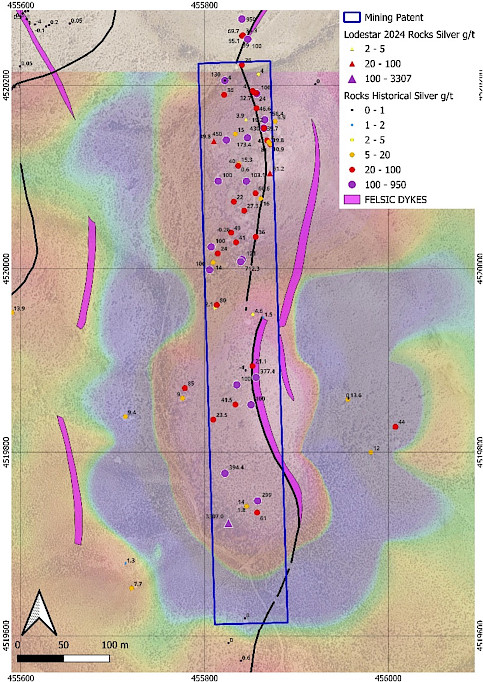 - The geology of the Black Diamond area is characterized by extensive irregular thrust faults and a close association with felsic dykes that were mapped by Cambior in 1997 (Figures 1 and 3). Rock chip assays by Lodestar at Black Diamond in 2024 indicate a close association of high grade silver with various other metals: gold up to 2.7 g/t, copper up to 0.5%, lead up to 1%, zinc up to 0.4% and pathfinder metals arsenic up to 1000 ppm, molybdenum up to 49 ppm, and antimony up to 955 ppm. This metal association suggests possible polymetallic, intrusion-related mineralization.