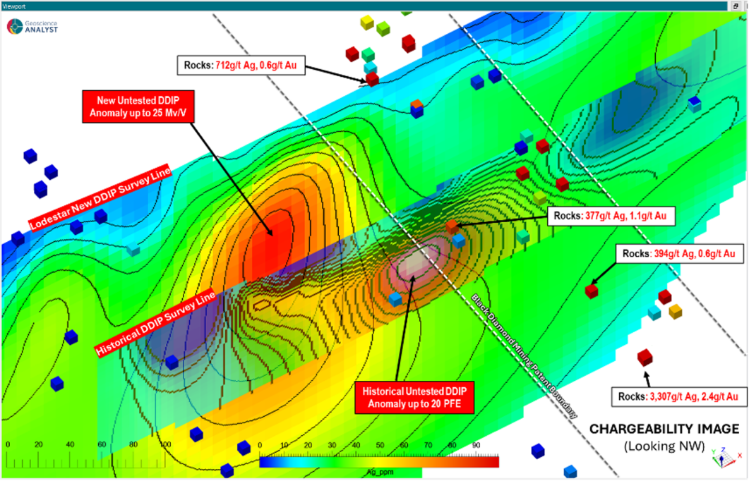 Figure 2: 3D Image looking northwest showing the Black Diamond Mining Patent (dash white) and highlight rock assays for silver and gold (coloured cubes) and associated DDIP chargeability anomalies.