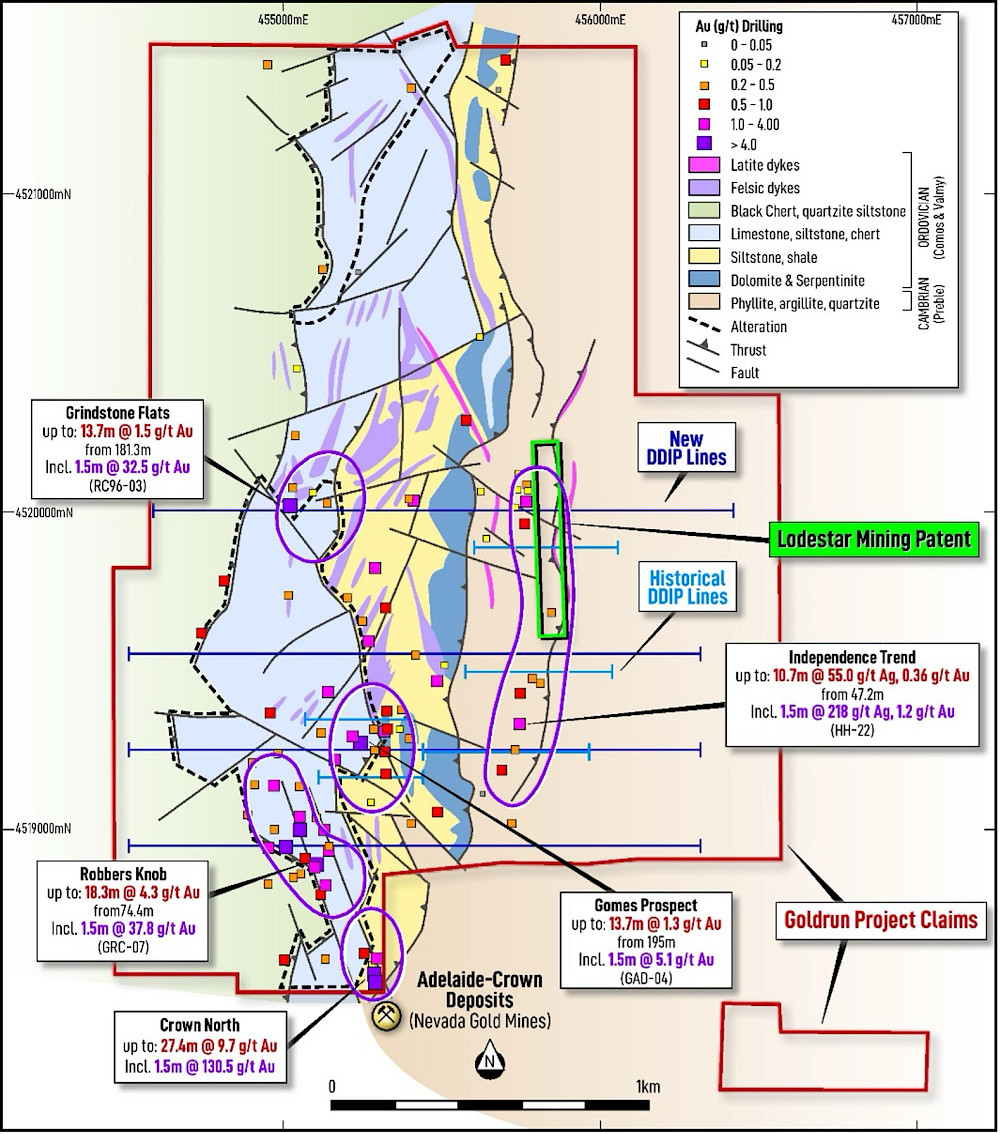 Figure 3: Interpreted bedrock geology map of the Gold Run Project showing the highlight gold intercepts from previous drilling, location of DDIP lines, and the location of the newly acquired Mining Patent.
