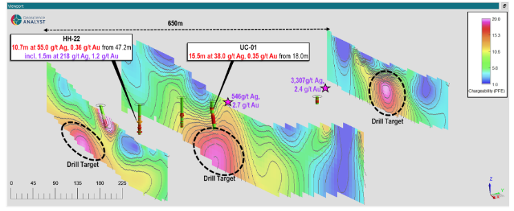 - These targets aim to test for an increase in width and grade of silver and gold at depth as suggested by the IP which is indicative of disseminated sulphide often associated with gold along an extensive 1km length structure (Figure 4).