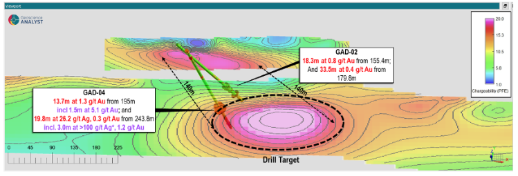 - The drilling focuses on targeting one very large and strong DDIP anomaly 200m wide located 140m along strike from significant intersections GAD-02 and GAD-04 (Figure 2).