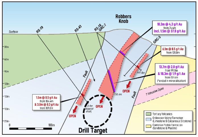 - Several significant historical gold intersections such as 13.7m at 2g/t Au* and 18.3m at 1.9 g/t Au* in RS-18 remain open and represent drill-ready targets to expand the deposit at depth (Figure 3).