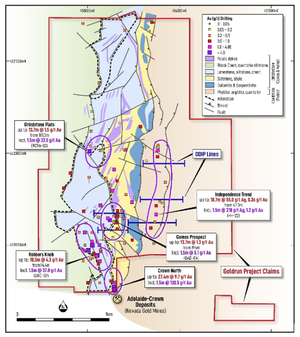 - Strong gold-, silver- and arsenic-in-soil geochemistry possibly indicative of epithermal style which supports the northern extension of the epithermal Adelaide-Crown deposits.