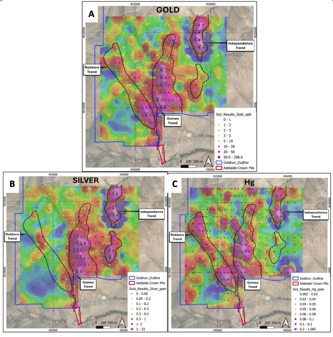 A) Gold Soils Results; B) Silver Soil Results; and C) Mercury Soil Results. Geochemical Maps Outline Three similar trends: