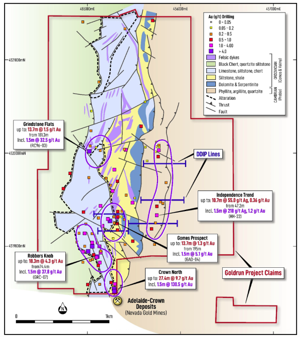 A one-kilometre-long gold-silver-mercury anomaly trending north with peak soil values up to 223 ppb gold and 7.8 g/t silver, centred on the Gomes Prospect. Historical drilling at Gomes returned 13.7 metres at 1.3 g/t gold, while the southern extension toward the Crown North Prospect includes intersections of 27.4 metres at 9.7 g/t gold near the Crown open pit. The metal association (Au + Ag + Hg) and mineralization style are typical of low-sulphidation epithermal systems, similar to those in the nearby Adelaide-Crown group of deposits. Historical DDIP surveys across the trend have identified strong chargeability anomalies with two drill-ready targets previously announced. The Gomes Trend is now interpreted as the northern extension of the same Adelaide-Crown epithermal system.